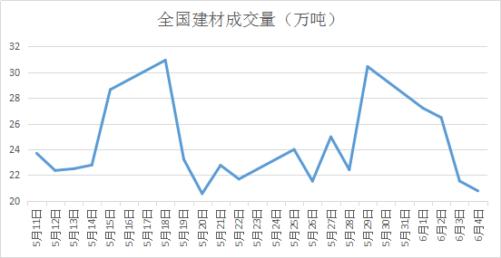 钢价自5月28日上涨,市场成交量于5月29日达到近期峰值,接近5月高点,此后持续回落,6月3日以来下滑明显,目前成交量处于5月低位20万吨左右。从市场反馈来看,商家报价下调10-20出货,华北成交整体好于华东地区。