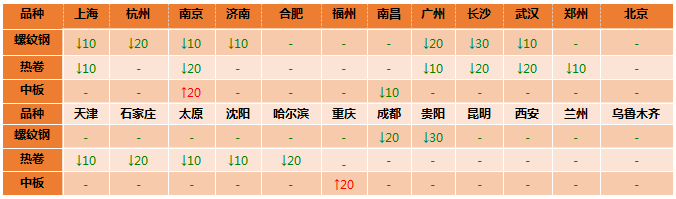 螺纹钢24个市场中9个市场下跌10-30,20mm HRB400E平均价格3809元/吨,较上个交易日下调6元/吨;