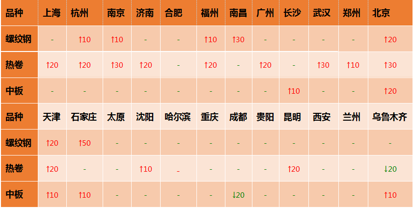 期货高开低走,现货报价小幅探涨。市场成交分化,建材好于热卷,部分商家提涨后成交一般,涨幅受限。市场报价多数持稳,少数10-30上调: