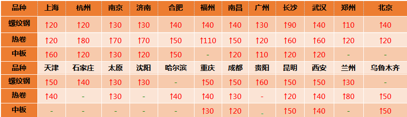 螺纹钢24个市场中22个市场上涨20-90,20mm HRB400E平均价格3761元/吨,较上个交易日上调36元/吨;
