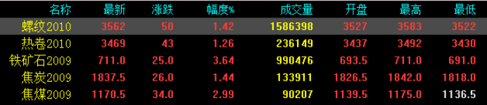 期螺涨50收报3562,期卷涨43收报3469,铁矿石涨25收报711,焦炭涨26收报1837.5,焦煤涨34收报1170.5。
