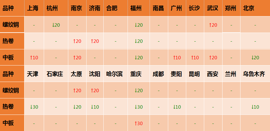 螺纹钢24个市场中,3个市场上涨20,3个市场下跌20,螺纹钢20mmHRB400E平均价格3642元/吨,与上个交易日价格相同。