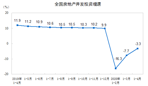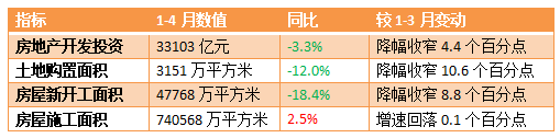 根据国家统计局数据,1-4月全国固定资产投资和房地产投资虽延续下降,但降幅较1-3月均有收窄。其中,1-4月,全国房地产开发投资33103亿元,同比下降3.3%,降幅比1-3月收窄4.4个百分点。