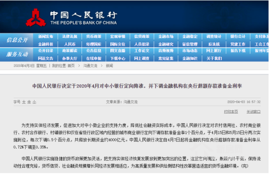 4月3日央行宣布对中小银行定向降准1个百分点,分别于4月15日和5月15日实施,每次下调0.5个百分点,共释放长期资金约4000亿元。此次降准两类机构:农村信用社、农村商业银行、农村合作银行、村镇银行等农村金融机构,和省级行政区主要服务于中小微企业的城市商业银行。