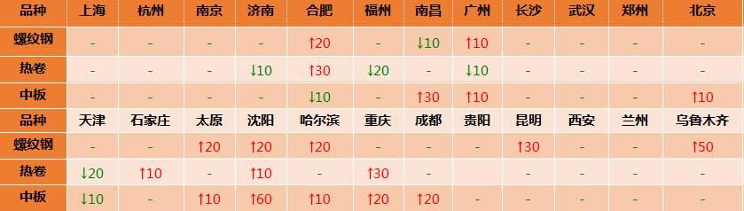 螺纹钢24个市场中7个市场上涨10-50,20mmHRB400E平均价格3768元/吨,较上个交易日上调10元/吨;