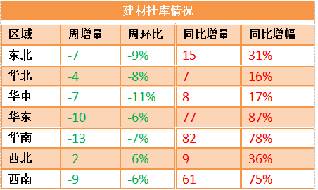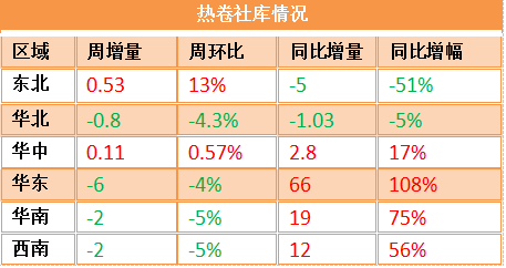 从各个区域主流仓库库存统计来看,建材降库继续扩大,周环比降幅均在6%以上,热卷降库有所分化。