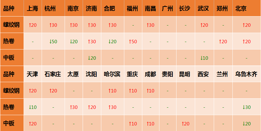 期货探涨提振现货报价短时上调,螺纹钢24个市场中13个市场上涨10-30,均价上调12;热卷24个市场中7个市场上涨20-50,3个市场下跌20-50,均价上调2;中板24个市场中4个市场上涨10-20,2个市场下跌10-20,均价上调1。