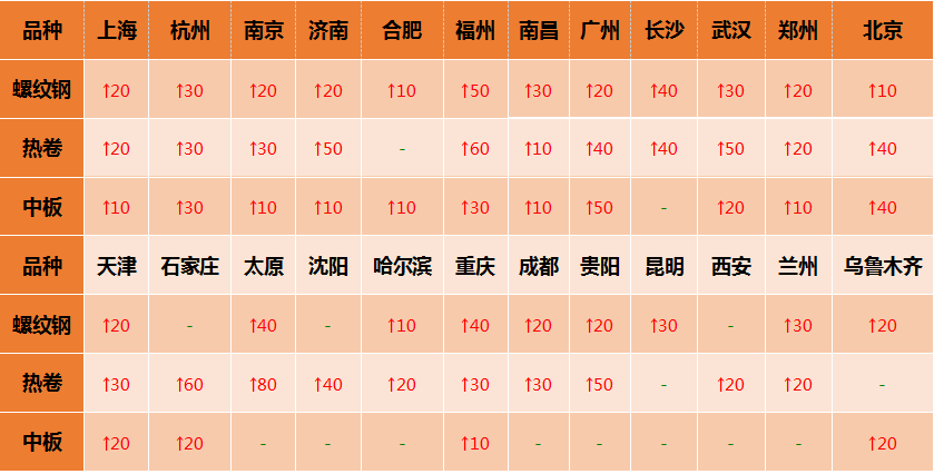 中板24个市场中16个市场上涨10-40,均价上调13。