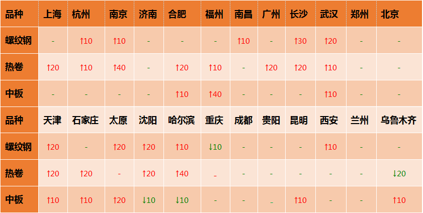 螺纹钢24个市场中10个市场上涨10-30, 20mmHRB400E平均价格3619元/吨,较上个交易日上调6元/吨;