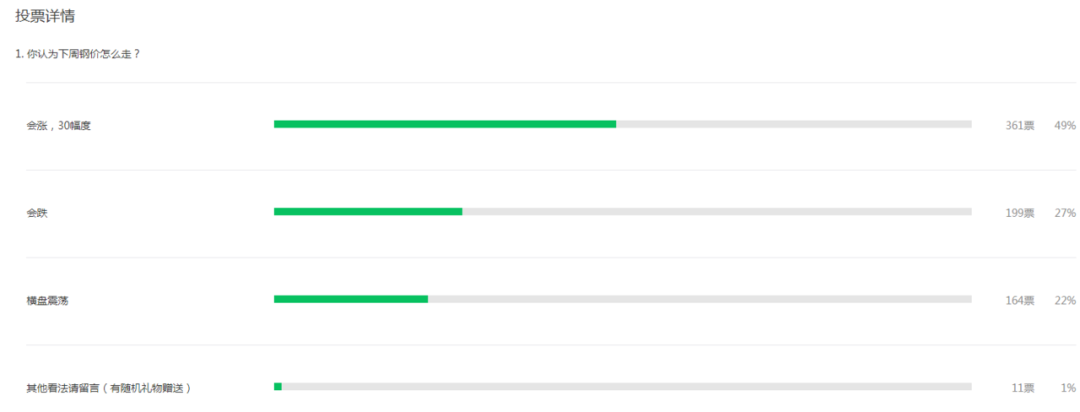 图为上周(5月9日)发起的投票,有49%的人认为钢价本周会涨;