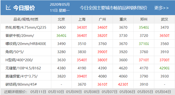5月11日沙钢出台5月中旬建材价格维稳。现Ф16-25mmHRB400螺纹钢出厂价3700元/吨,Ф8-10mmHRB400盘螺出厂价3800元/吨,Φ6.5mmHPB300高线出厂价3760元/吨。对完成上期计划量,对螺纹补80元/吨,盘螺补100元/吨,高线补100元/吨。
