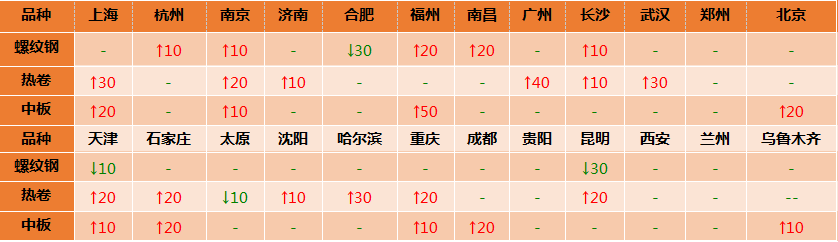 螺纹钢24个市场中5个市场上涨10-20,2个市场下跌10-30,20mmHRB400E平均价格3805元/吨,较上个交易日价格相同;