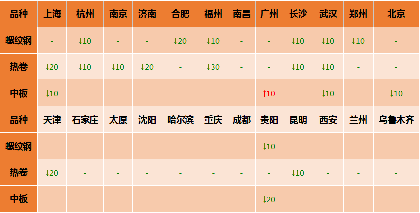 螺纹钢24个市场中11个市场下跌10-20,20mmHRB400E平均价格3590元/吨,较上个交易日下调4元/吨;
