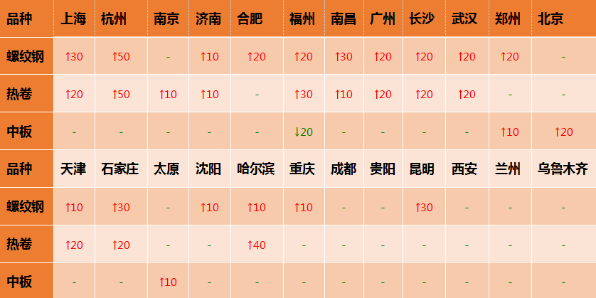 今日期货尾盘大幅拉涨,现货情绪受到提振。商家挂价出货,以降库优先,整体成交好转,但部分地区高价出货不畅,市场对此轮上涨比较谨慎,多数按需采购。各品种报价如下: