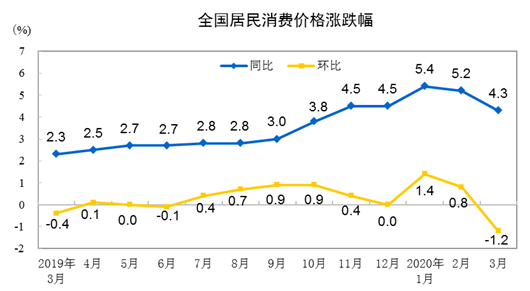 国家统计局数据显示,中国3月CPI同比增长4.3%,预期增长4.8%,前值增长5.2%。其中,食品价格上涨18.3%,涨幅回落3.6个百分点,影响CPI上涨约3.70个百分点。食品中,猪肉价格上涨116.4%,涨幅回落18.8个百分点。CPI同比持续两个月下滑,意味着通胀风险正在缓解,同时也给货币政策留出更大调控空间。