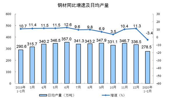 国家统计局数据显示,1-2月我国粗钢、生铁和钢材产量分别为15470万吨、13234万吨和16713万吨,同比分别增长3.1%、增长3.1%和下降3.4%。1-2月日均产量分别为257.83万吨、220.57万吨和278.55万吨,日均环比分别下降5.2%、增长2%和下降17.2%。