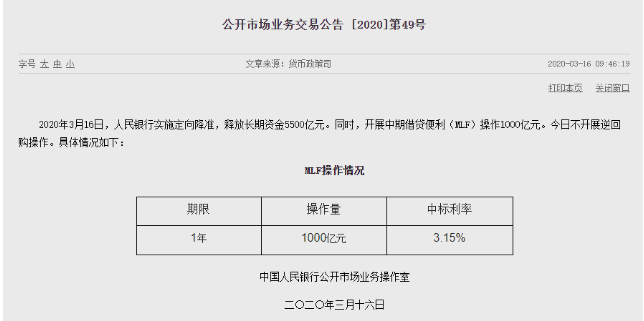 央行公告显示,3月16日央行实施定向降准,释放长期资金5500亿元。同时,开展中期借贷便利(MLF)操作1000亿元。今日不开展逆回购操作。