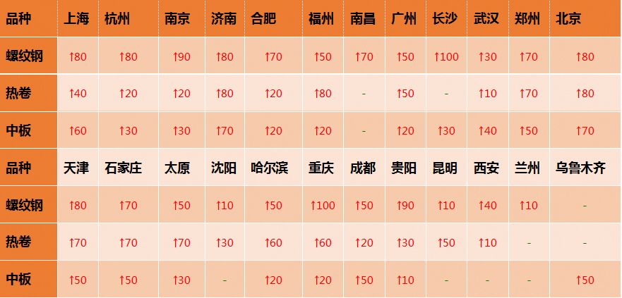 现货方面,全国24个市场中23个市场上涨10-100,均价上调59;热卷24个市场,20个市场上涨10-80,均价上涨40;中板24个市场中20个市场上涨10-70,均价上调29。