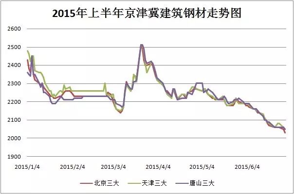 2015年1月1日开始施行史上最严的环保法,一开始就为本年的钢铁企业施加上了一条牢牢的“枷锁”,随着春节的临近进入钢市的传统的“休眠期”,春节过后,京津冀地区建材便进入了“低谷期”跌跌不休,中途虽有所反弹,但在需求未见放量、成本支撑缺失的影响下,反弹只是“昙花一现”难以维持。随后,京津冀建材价格以连续下跌的状态呈现,市场预期看空,在萎靡不振的需求和悲观的心态联动下,市场频探新低。
